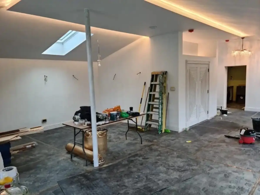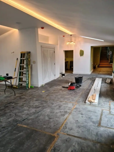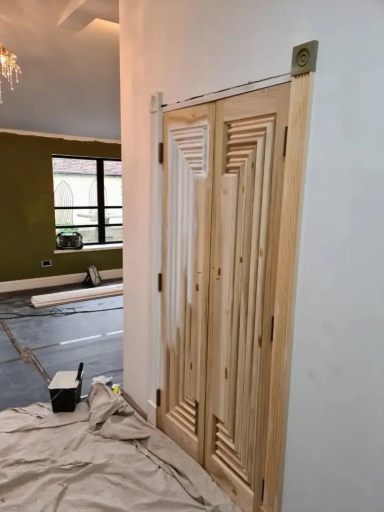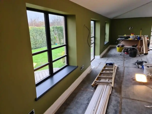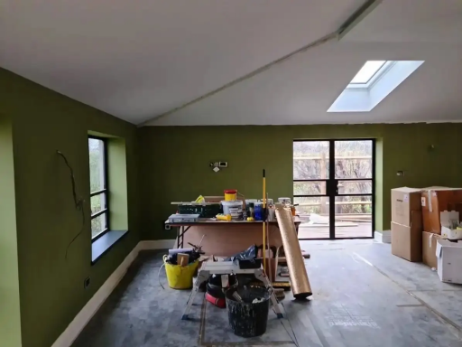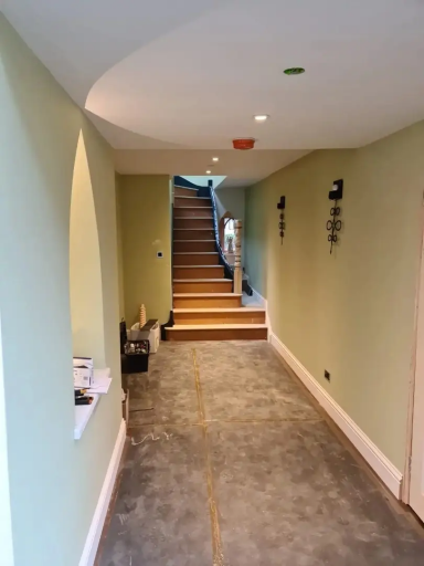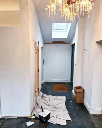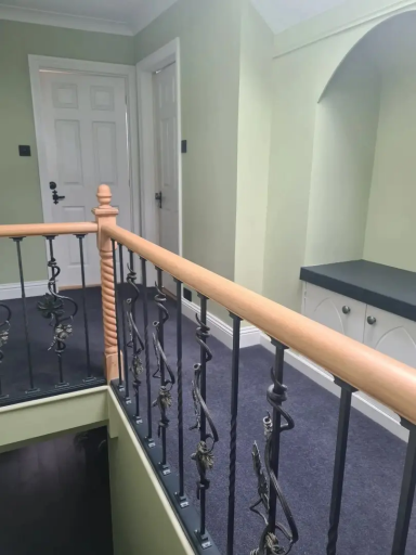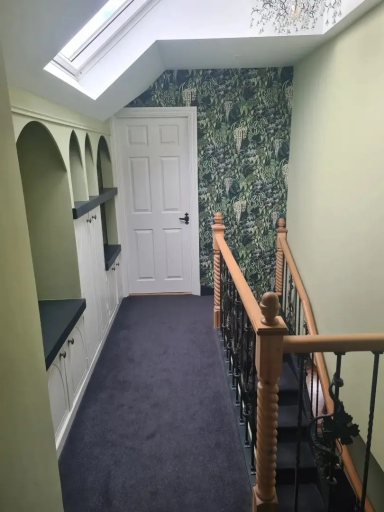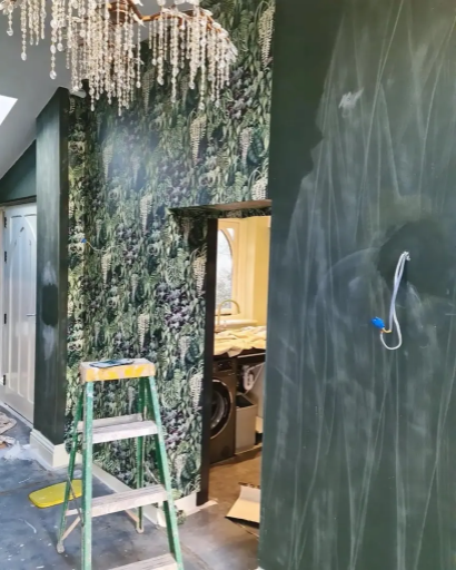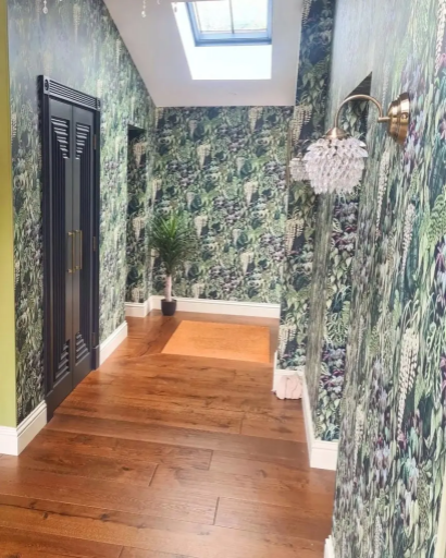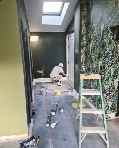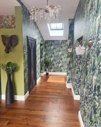 This one was a team effort. For the living room, we used Dulux paint in Celtic Forest, Cole & Son wallpaper in Singita and for the hallways and landing, we used Farrow & Ball paint in Railings, Dulux paint in Chiffon White, Osbourne & Little wallpaper in Green Wall 02.